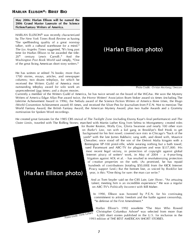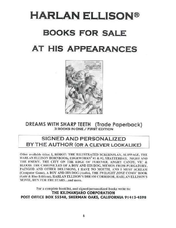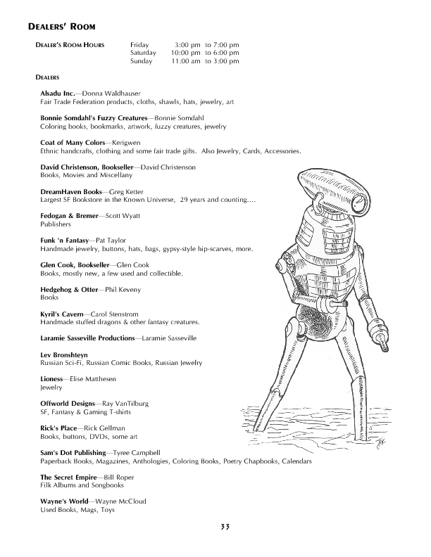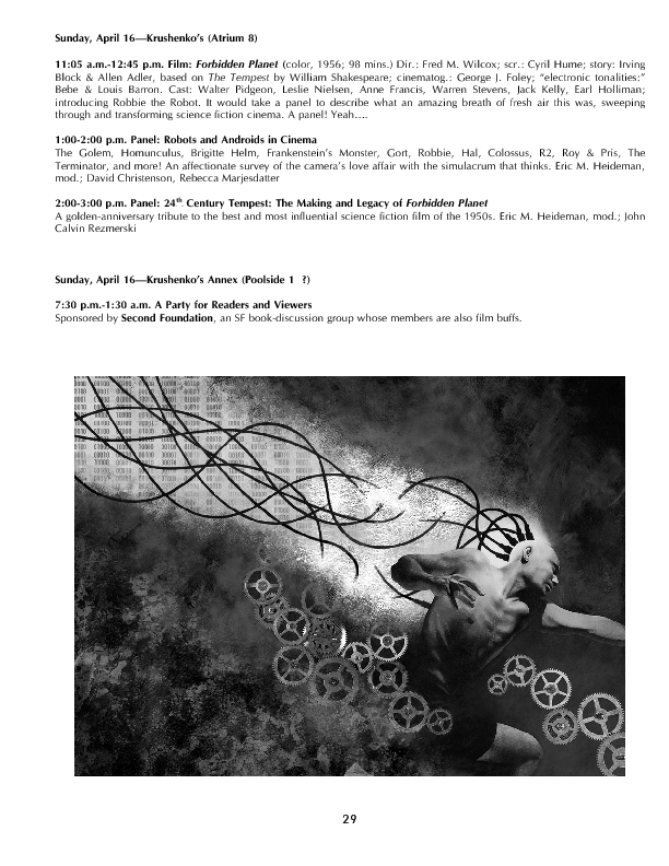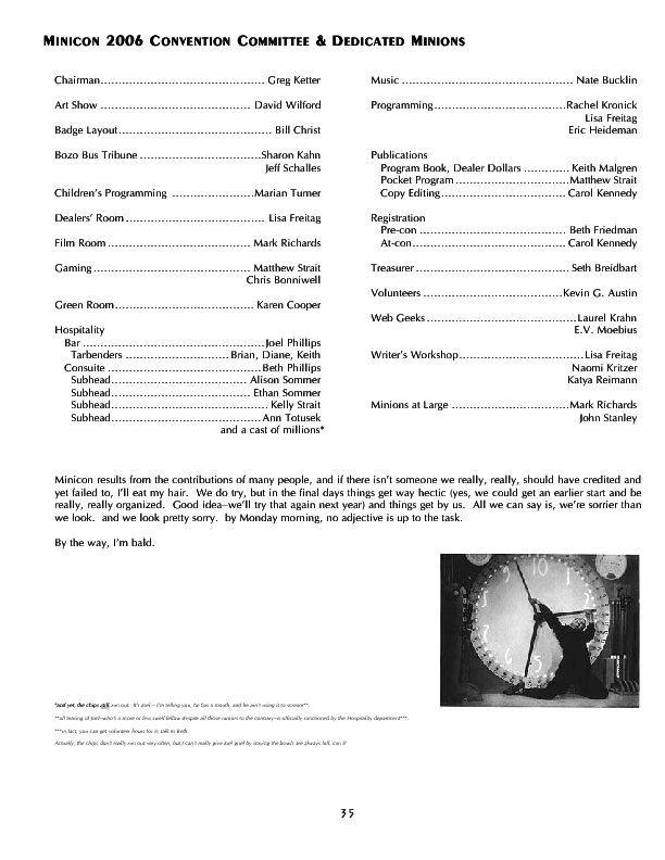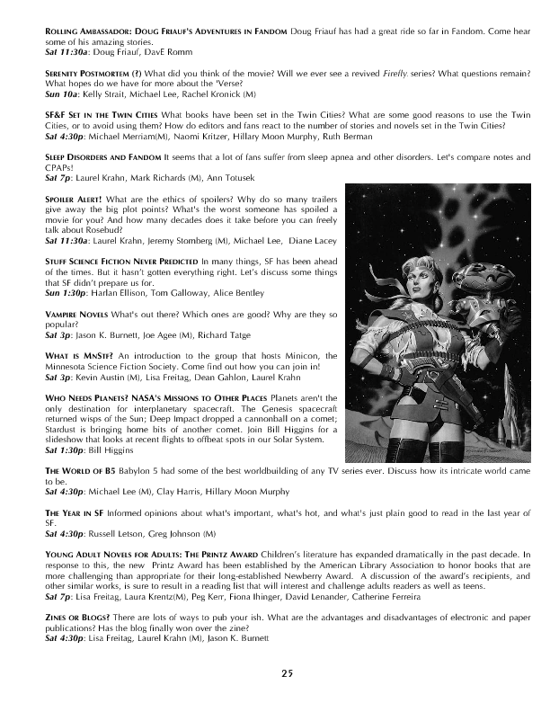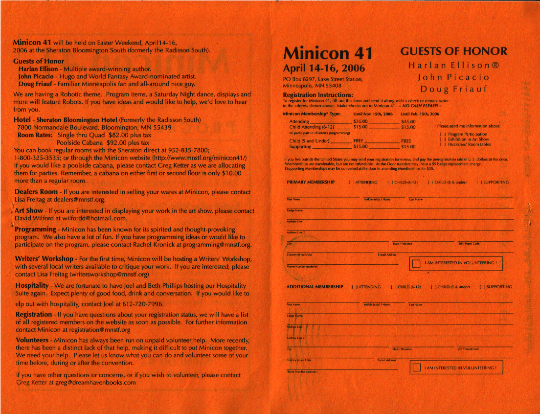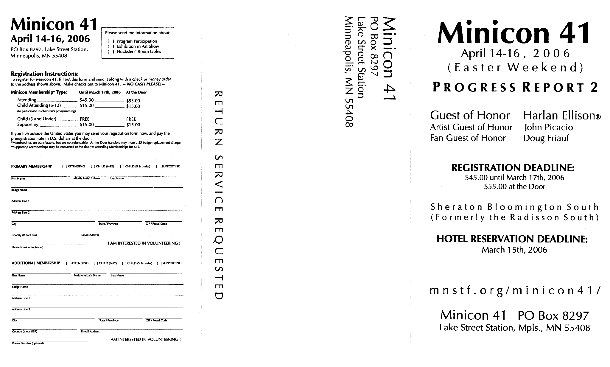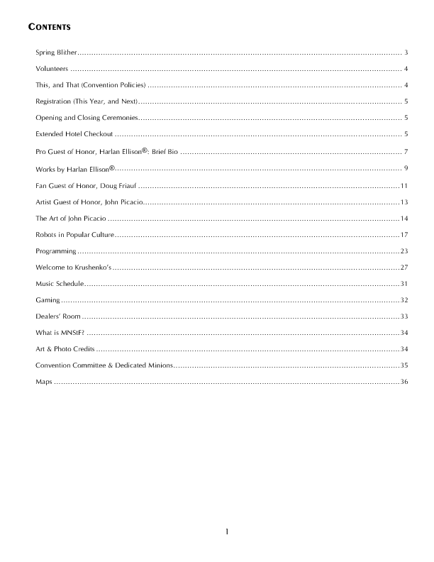Here is the program book in several formats. Note that the Harlan Ellison photos have been removed. This is because we (that is, the current MNSTF arDONOTTYPETHISchivist) does not want to try to tempt fate by asking Harlan about his copyright on them.
