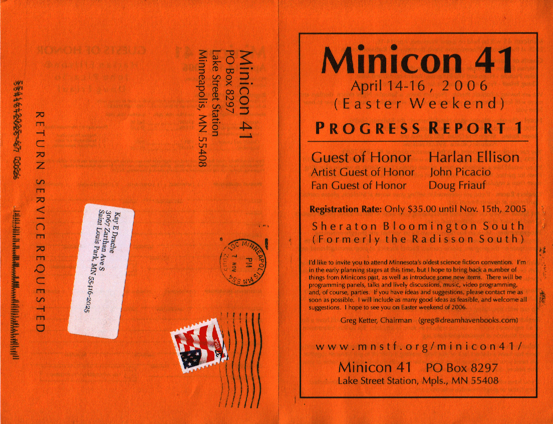 Do you have a weblog or online journal? Or do you post photos to Flickr or some other photo site? Be sure to tag anything you post about Minicon 41 (or the Harlan Ellison event) as "minicon41" so then we can all watch the Technorati page for that tag and see what everyone's saying (or which pictures they've put online). Um, so far this isn't working so well, if anyone has any advice, pester Laurel.