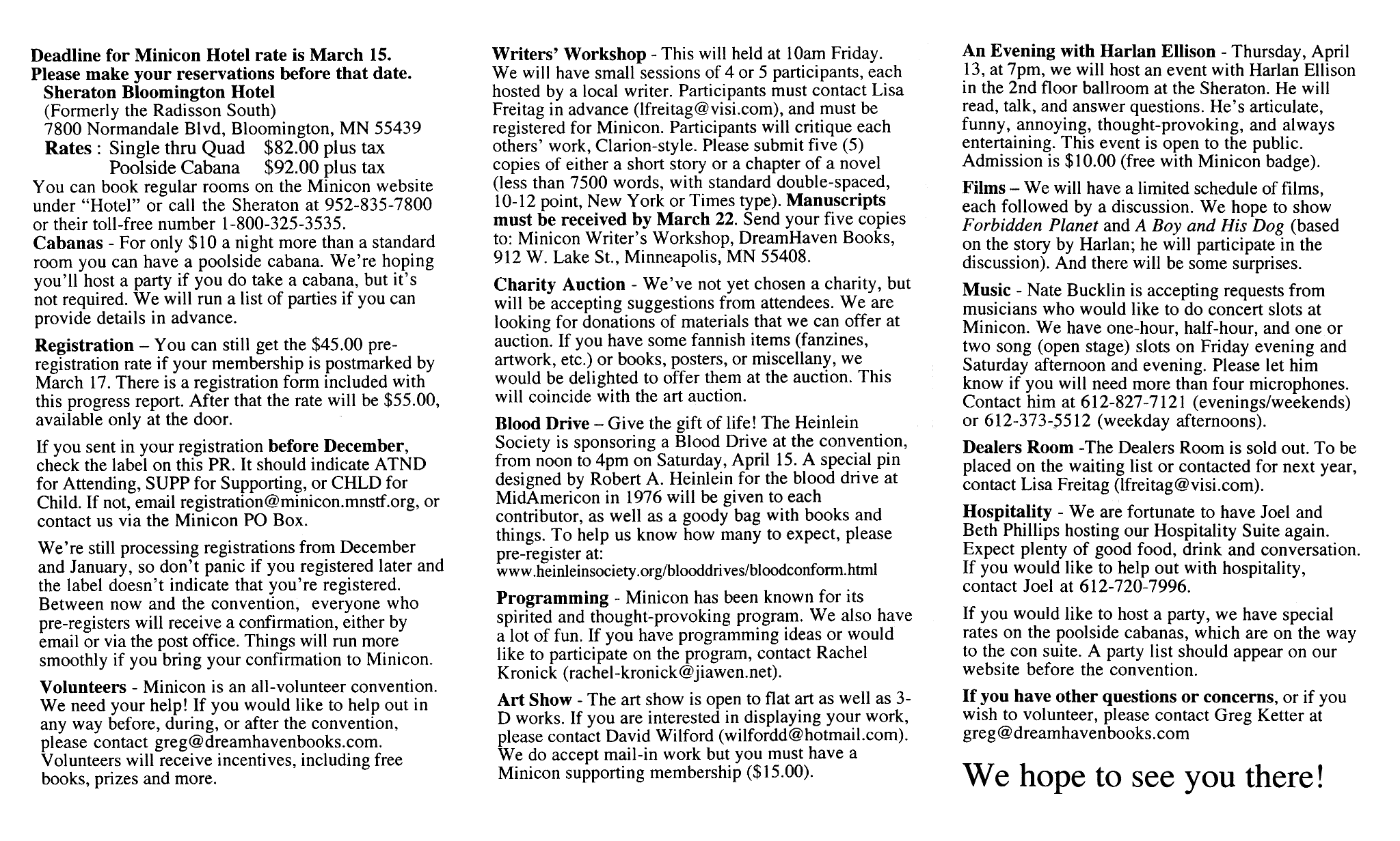 Need to contact us? Don't send us email! By now your best bet is probably to track us down at the convention hotel or via phone as many of the department heads will be at the hotel Thursday - Monday and few of us will be checking email (fewer still, if any, will be checking email with any regularity). The information on this site should give you some idea who'll be where when. If you aren't at Minicon, you can call the Sheraton Bloomington and try asking to speak with someone with Minicon.