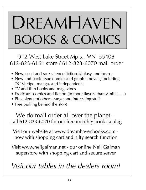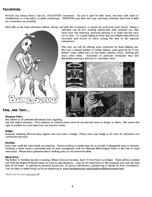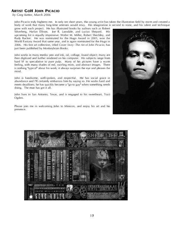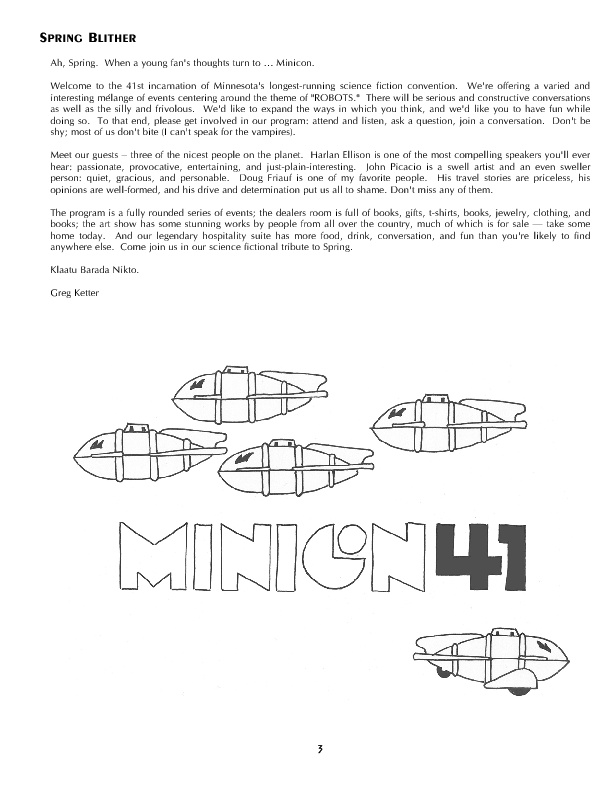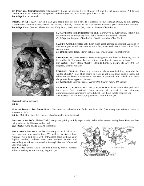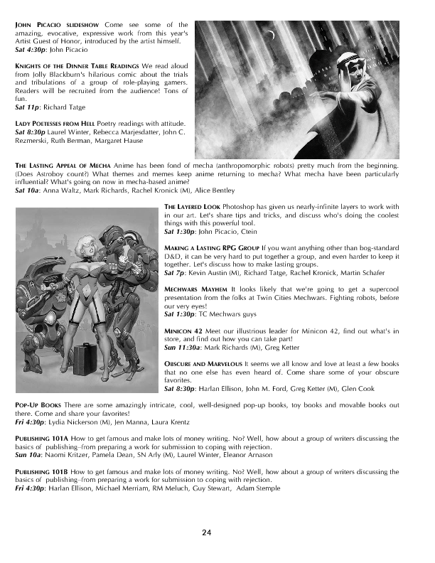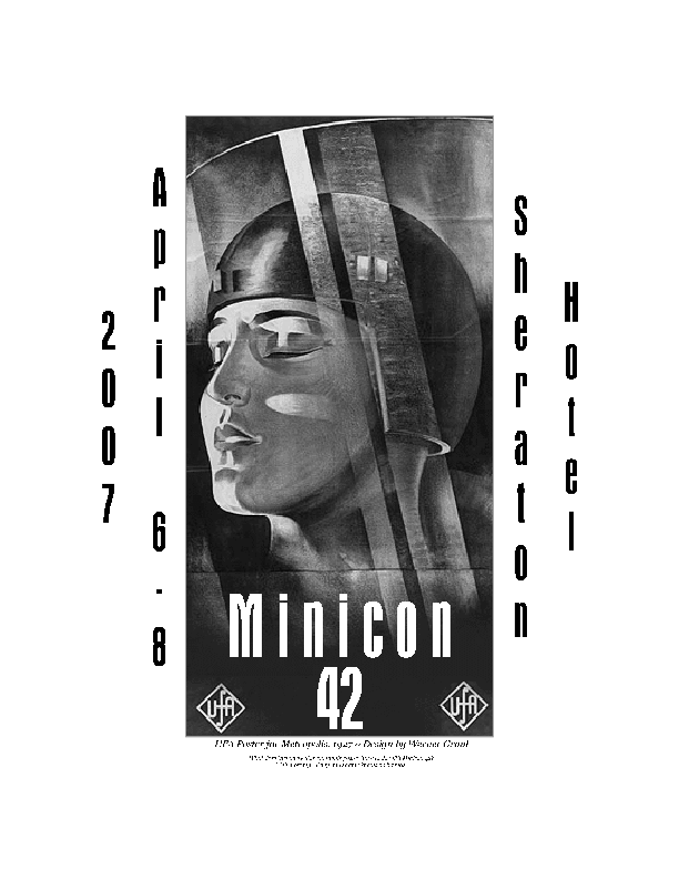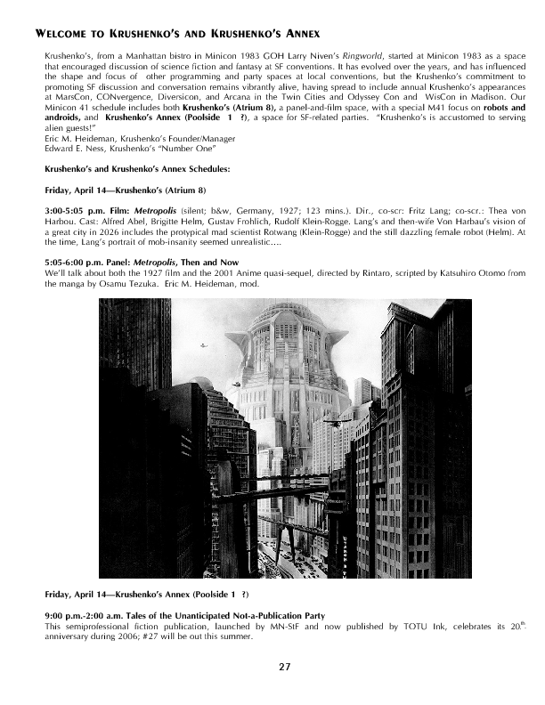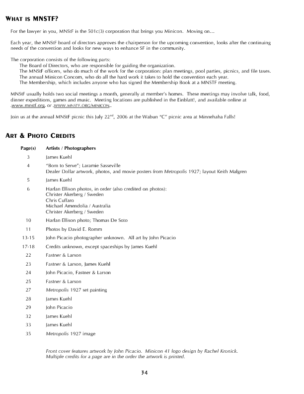 Creative Commons License Except as noted below, The Minicon 41 Program Book is by The Minnesota Science Fiction Society, Laramie Sasseville, or Dave Romm (as indicated internally) and is licensed under the Creative Commons Attribution-Noncommercial-Share Alike 3.0 United States License. The Metropolis 1927 art is believed to be public domain. Art by John Picacio is © John Picacio and reproduced here by permission. Harlan Ellison bio is not credited, but is likely © Harlan Ellison. Beware. John Picacio photographer is unknown; if you're the cautious type, assume it is © someone and reproduced here by permission. Art by James Kuehl is © James Kuehl and reproduced here by permission. Advertisements are property of the advertisers. (I know this is a long list of exceptions, but I swear there's still a fair bit left when you get to the end.)