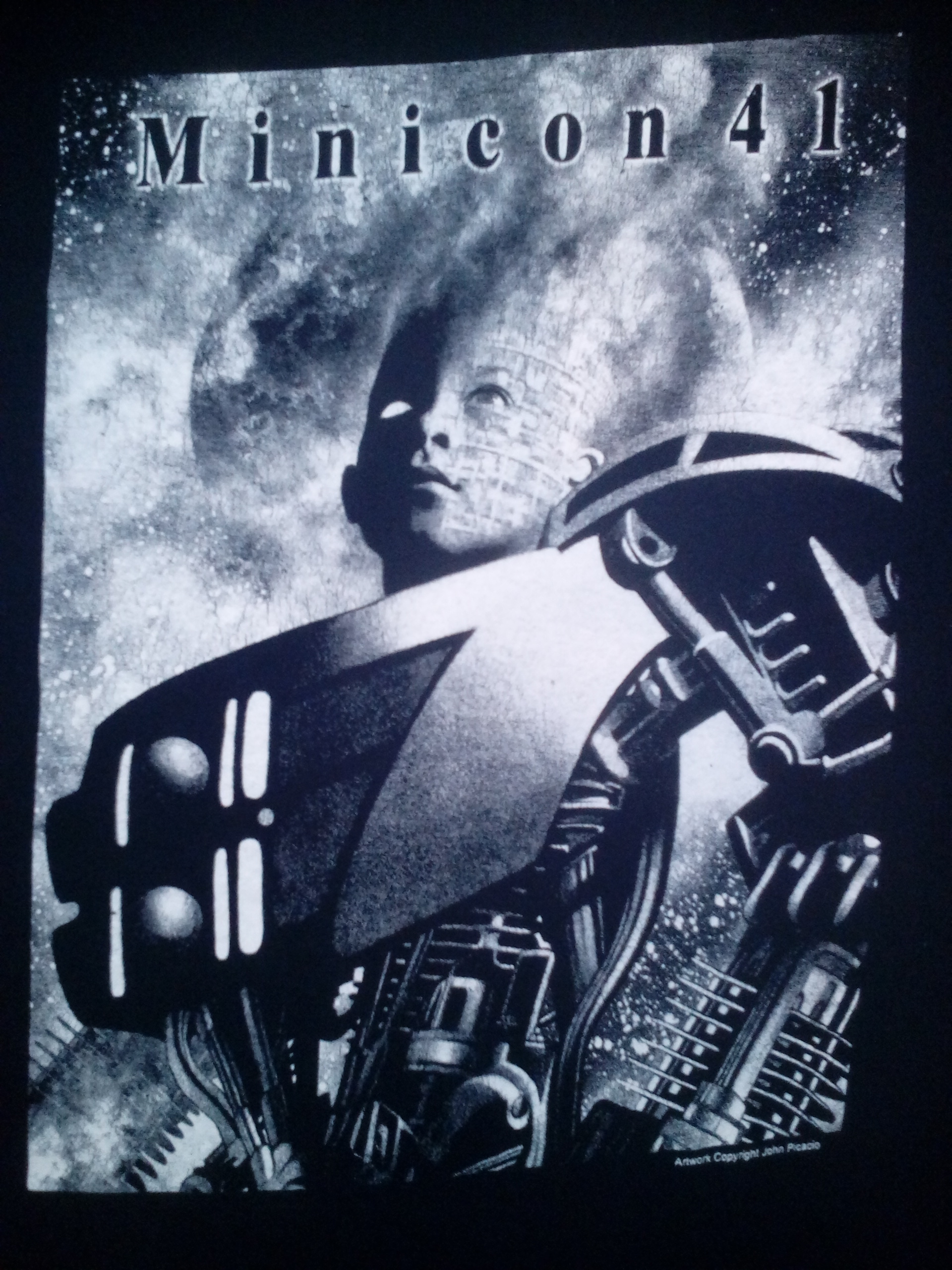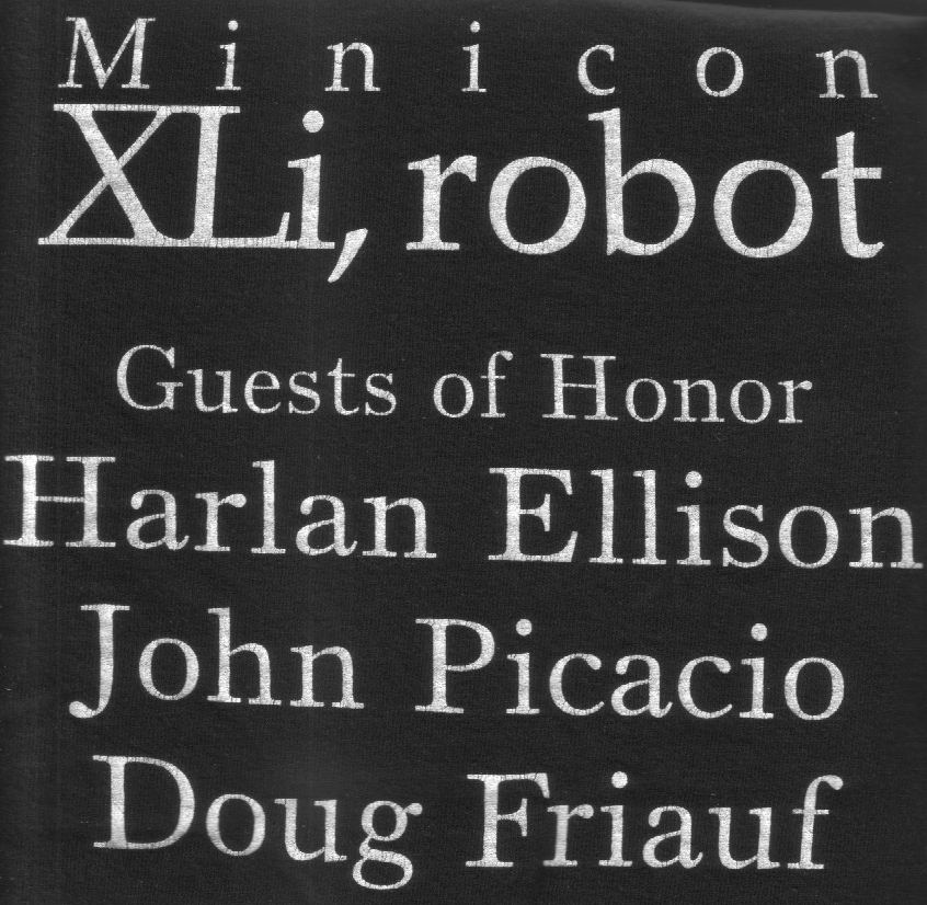 Minicon 41 shirt, front Minicon 41 shirt photo, front Minicon 41 shirt photo, back, reading: 'Minicon XLi, robot. Guests of Honor: Harlan Ellison, John Picacio, Doug Friauf