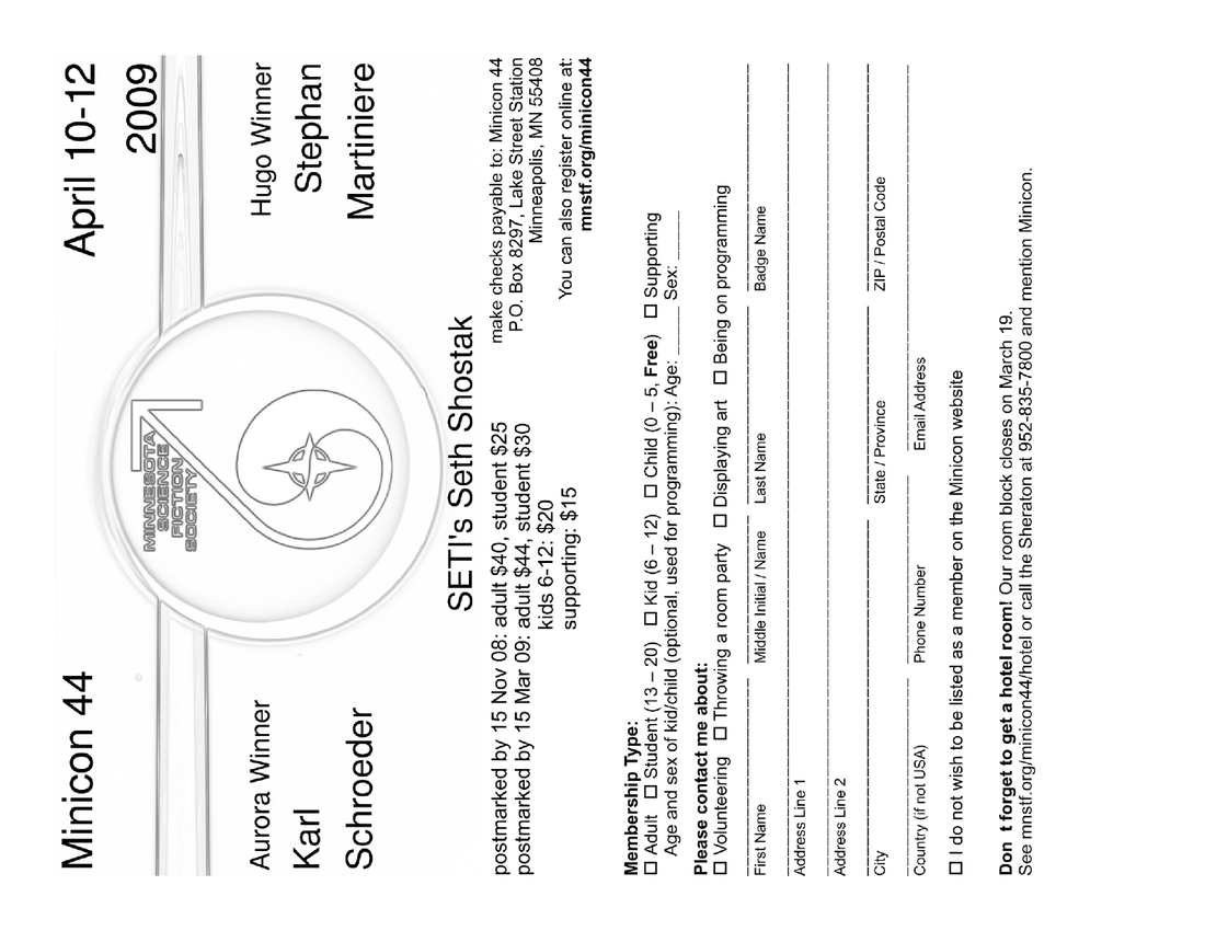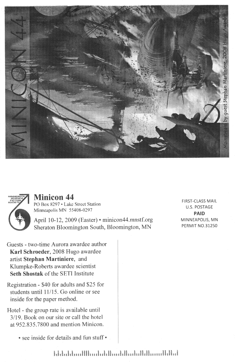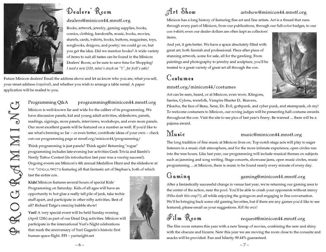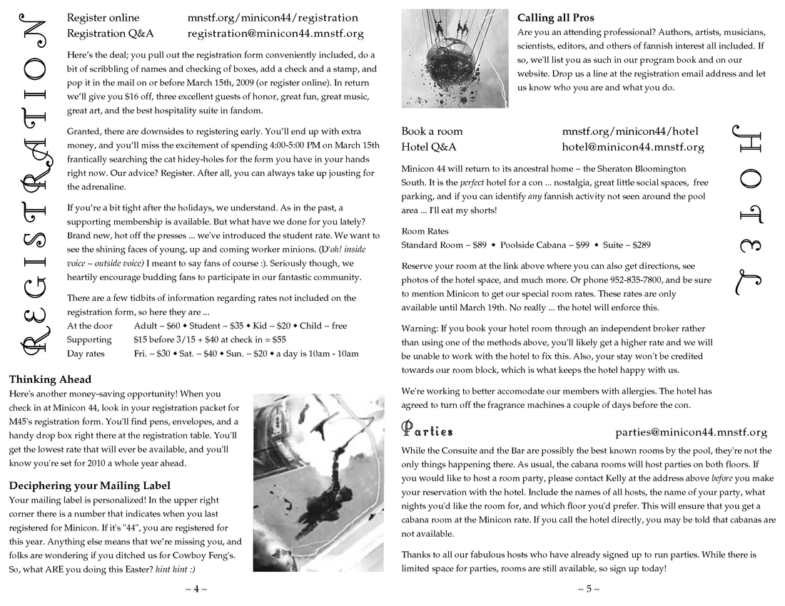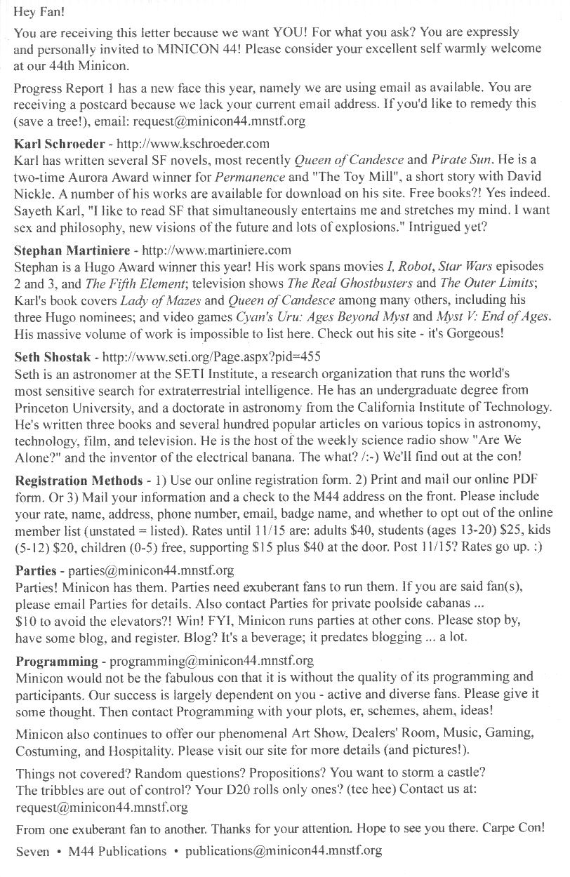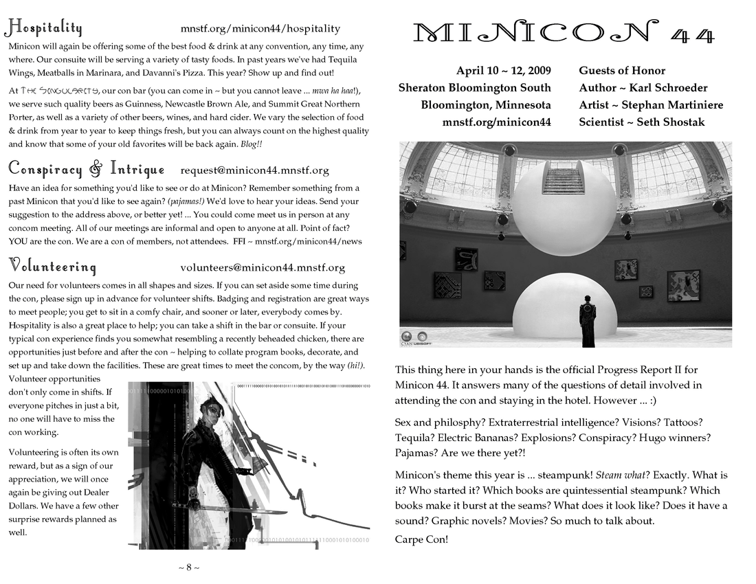 Minicon 44 Progress Report 2 in PDF (23 MB) or page images: Outside | Reg form | Pages 8 and 1 | Pages 2 and 3 | Pages 4 and 5 | Pages 6 and 7