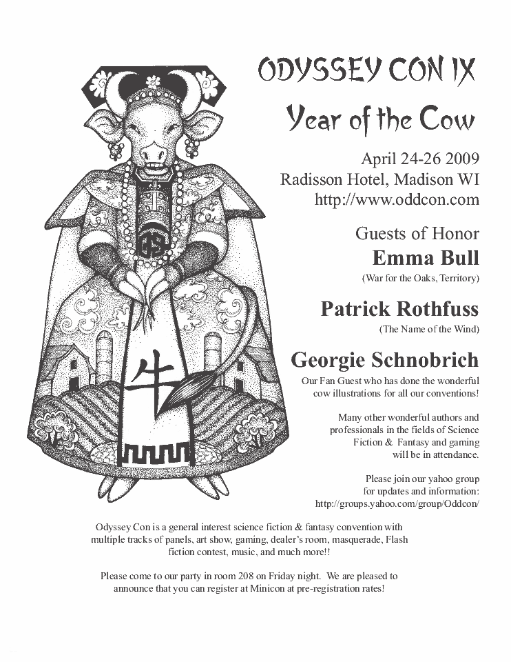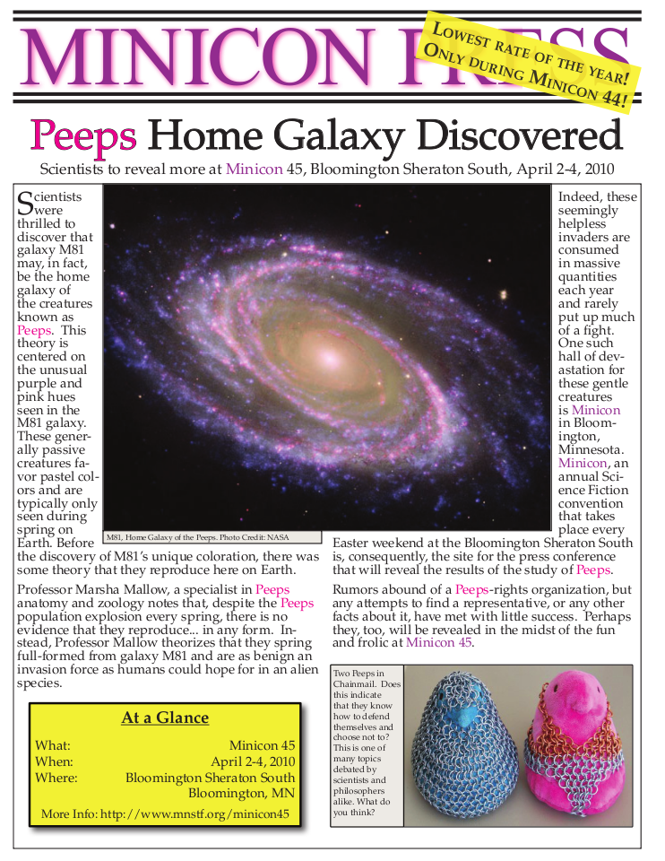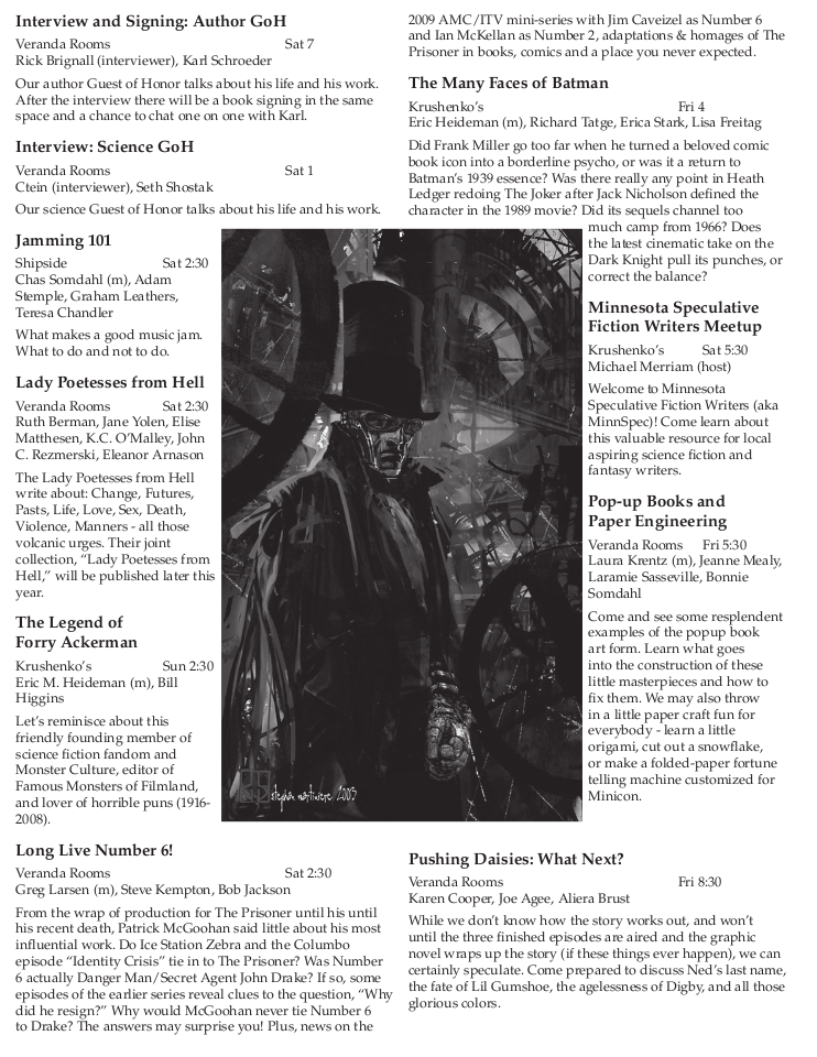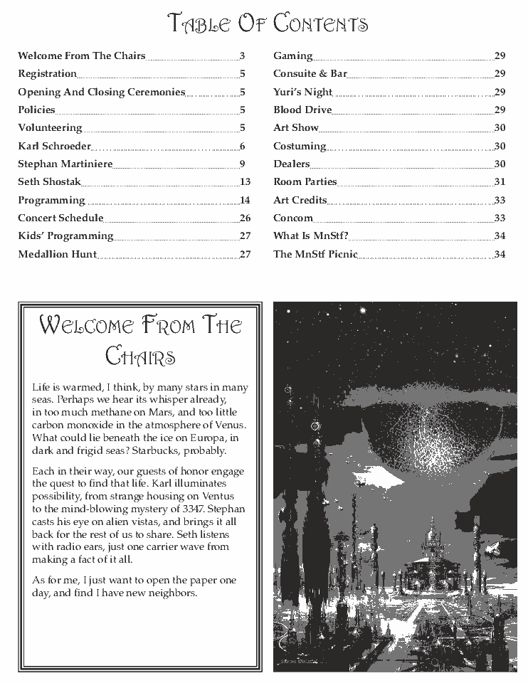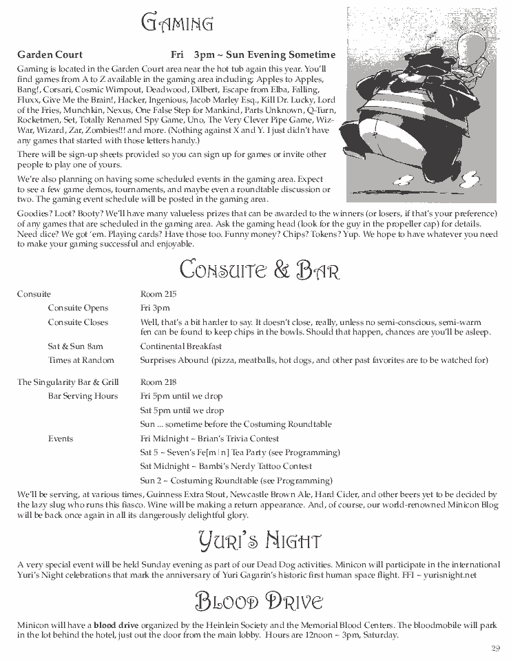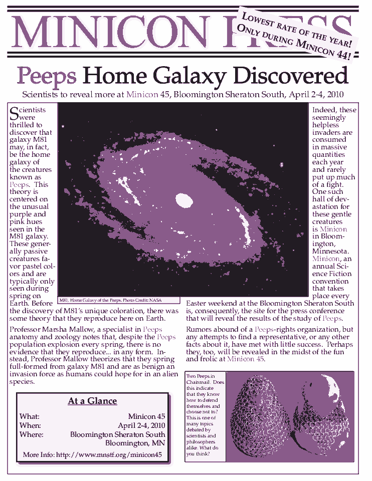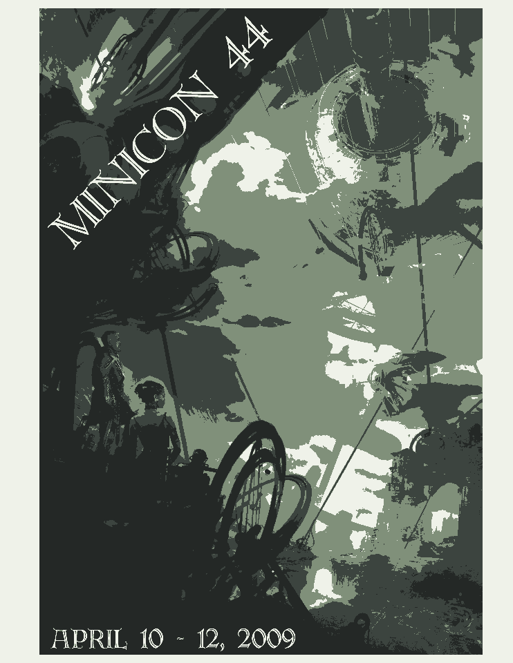 Minicon 44 Progress Report 2 in PDF (23 MB) or page images: Outside | Reg form | Pages 8 and 1 | Pages 2 and 3 | Pages 4 and 5 | Pages 6 and 7