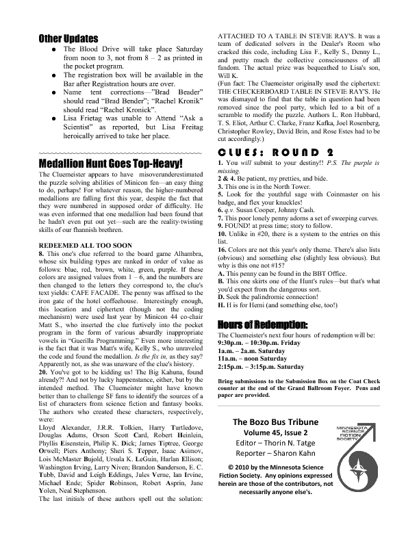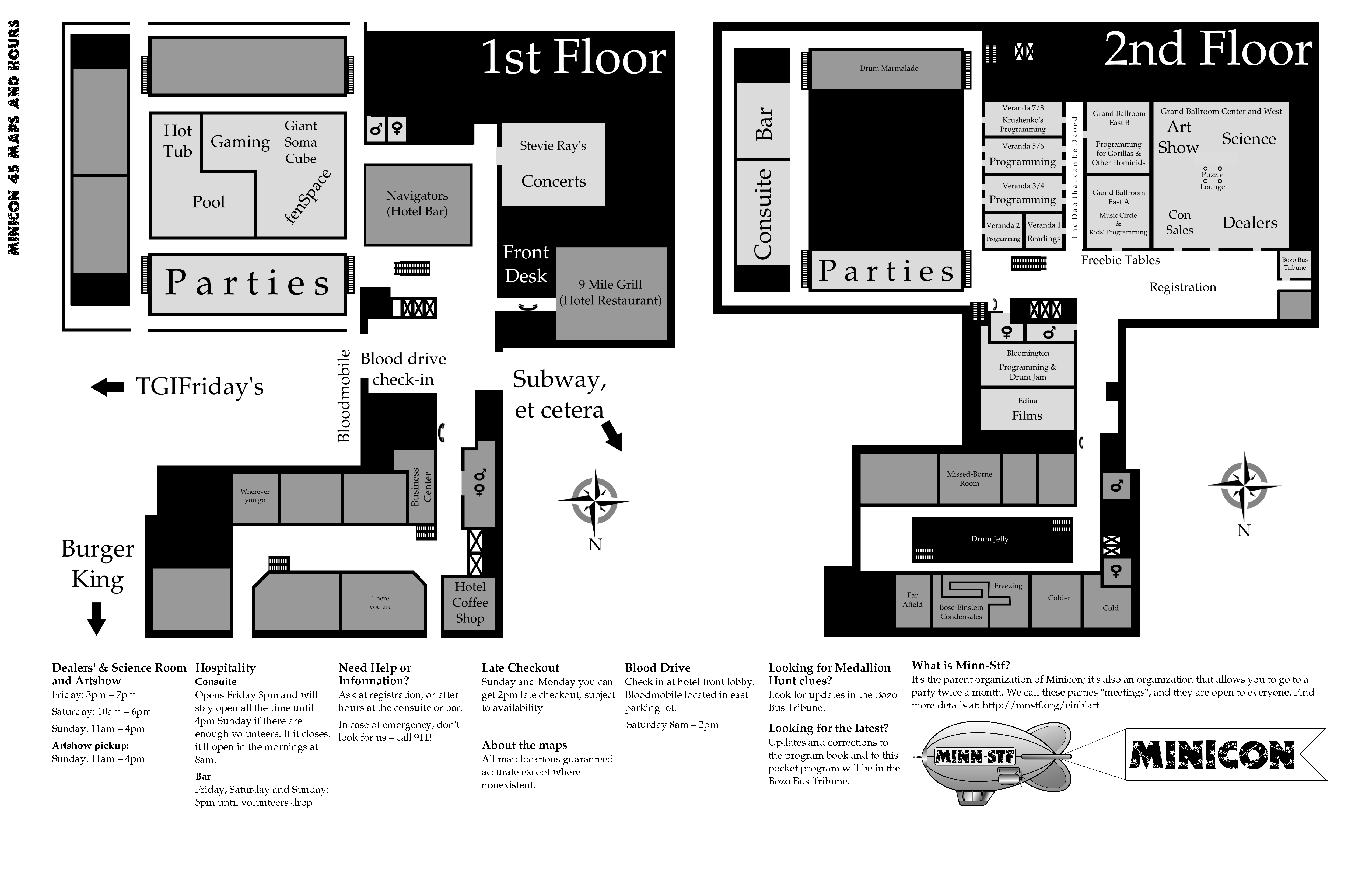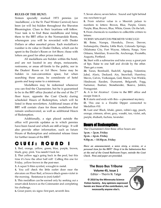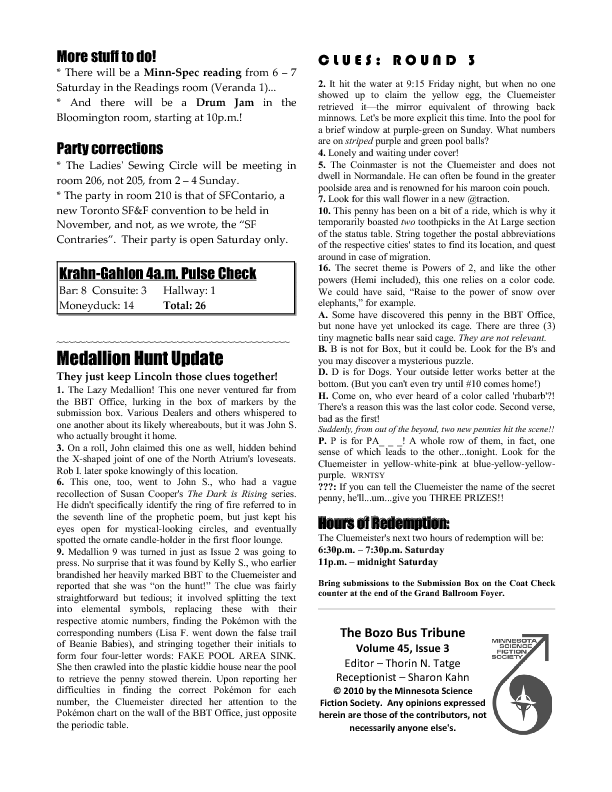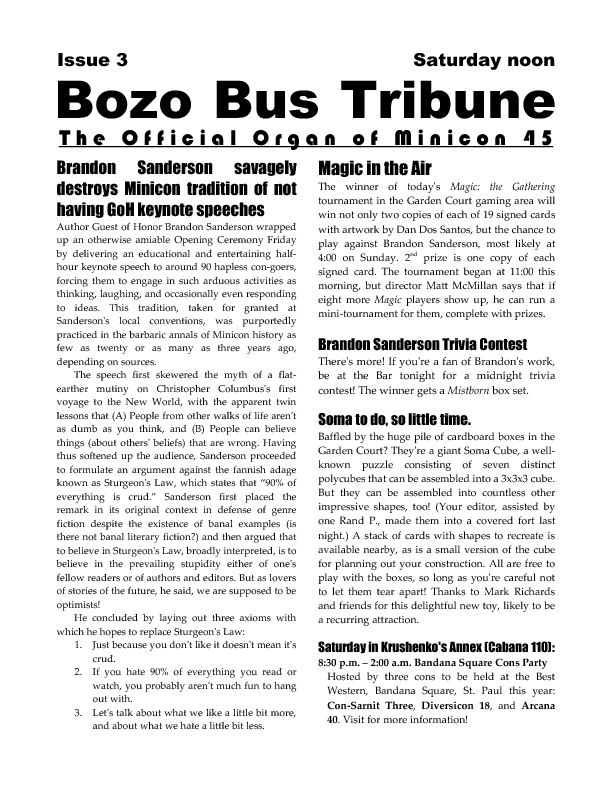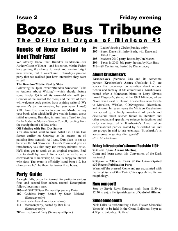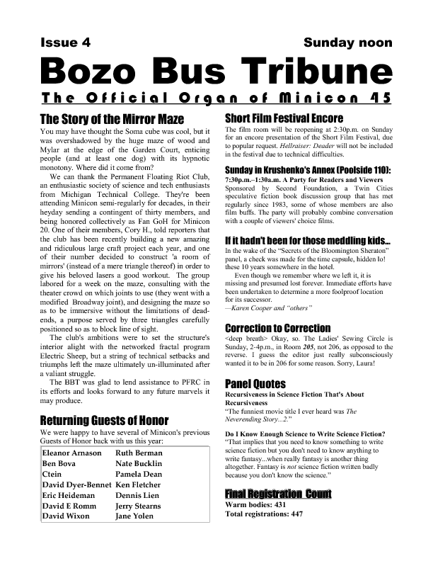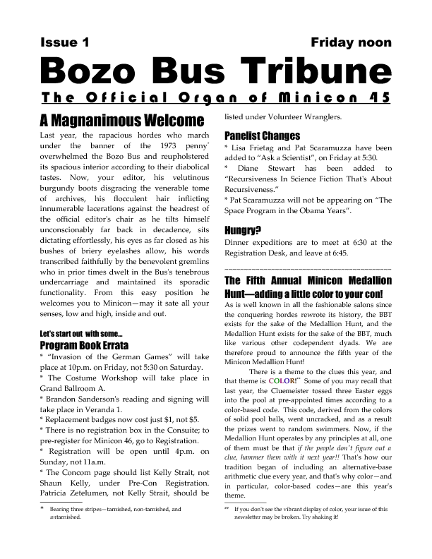 Program BookHere's the Minicon 45 Program Book in PDF. And in case you can't read PDFs, here are page images: front cover | inside front cover | 1 | 2 | 3 | 4 | 5 | 6 | 7 | 8 | 9 | 10 | 11 | 12 | 13 | 14 | 15 | 16 | 17 | 18 | 19 | 20 | 21 | 22 | 23 | 24 | 25 | 26 | 27 | 28 | inside back cover | back cover. And here's the Moshe Feder addendum (PDF) and the same in PNG — this was a separate sheet stuffed in the main book. Pocket ProgramThe Minicon 45 Pocket Program (PDF) was made available on the web the week before the con. (We also gave each member a paper copy when they arrived. Here's the version we printed. It has a few errors relative to the version linked above which we kept fixing after the paper one went to press.) Includes maps of the convention. And here are images of the same (the first one above): the side with the program grid, the side with the map. Bozo Bus TribuneAnd here are the issues of the Minicon 45 at-con newsletter, the Bozo Bus Tribune: