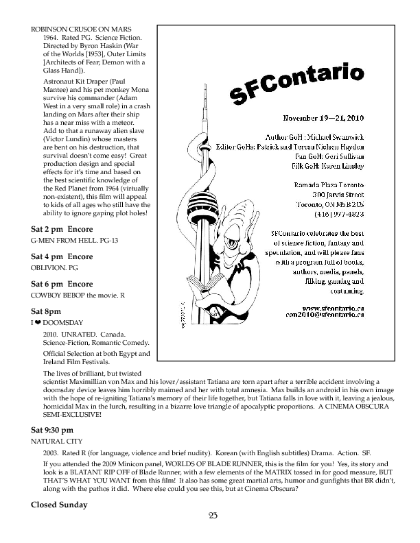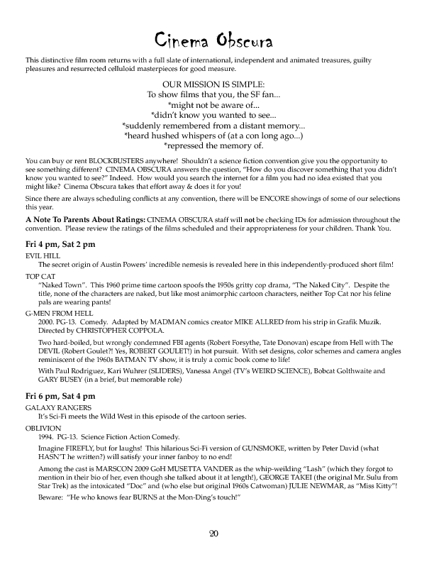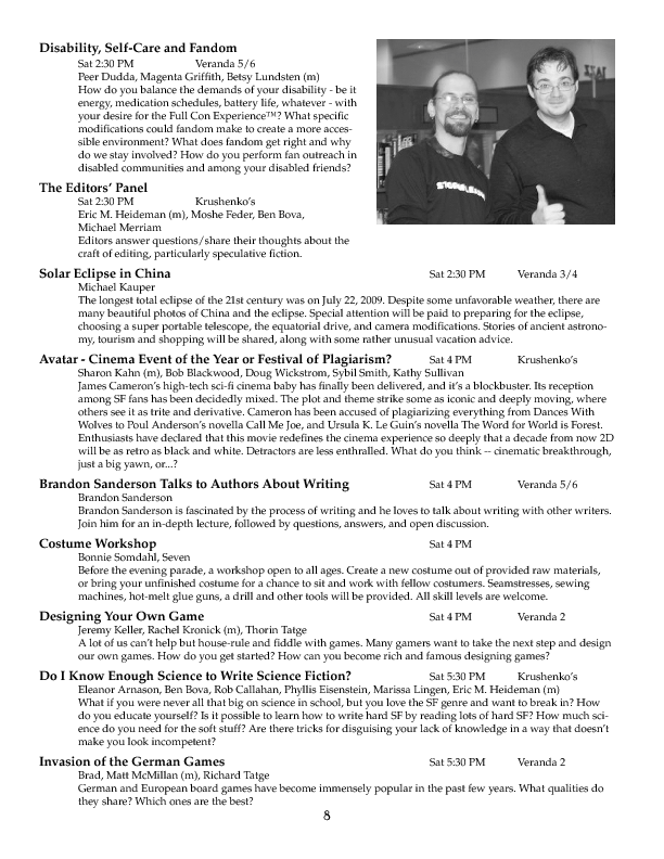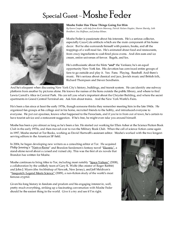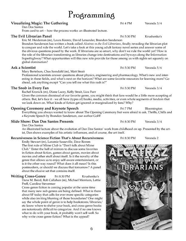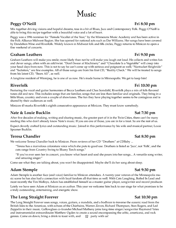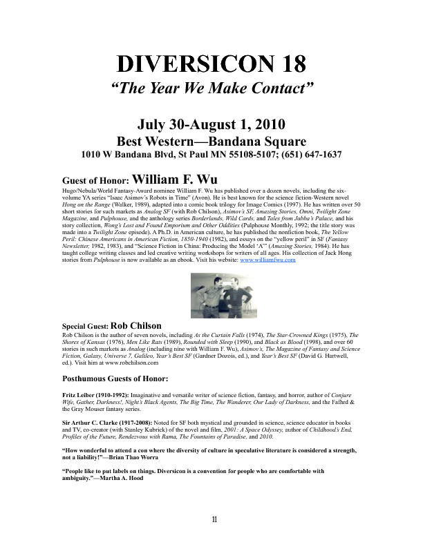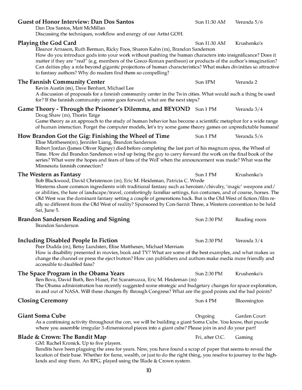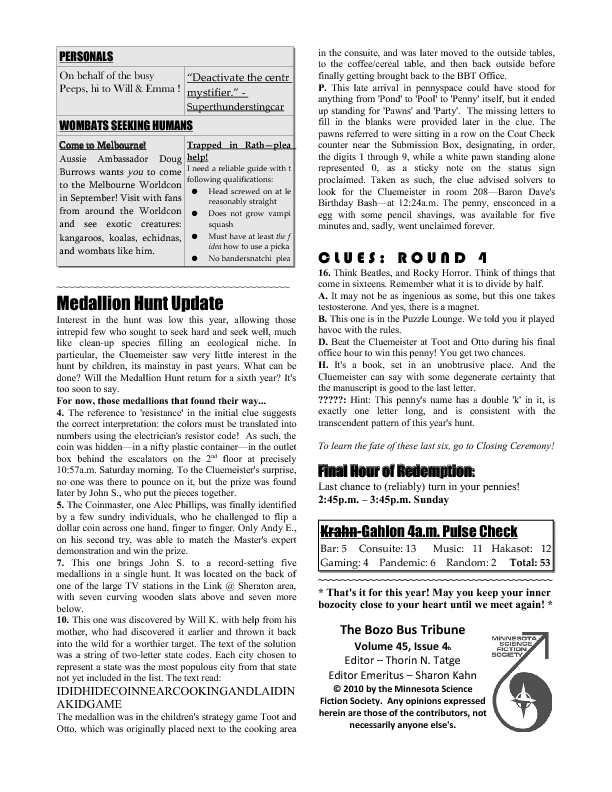 Program BookHere's the Minicon 45 Program Book in PDF. And in case you can't read PDFs, here are page images: front cover | inside front cover | 1 | 2 | 3 | 4 | 5 | 6 | 7 | 8 | 9 | 10 | 11 | 12 | 13 | 14 | 15 | 16 | 17 | 18 | 19 | 20 | 21 | 22 | 23 | 24 | 25 | 26 | 27 | 28 | inside back cover | back cover. And here's the Moshe Feder addendum (PDF) and the same in PNG — this was a separate sheet stuffed in the main book. Pocket ProgramThe Minicon 45 Pocket Program (PDF) was made available on the web the week before the con. (We also gave each member a paper copy when they arrived. Here's the version we printed. It has a few errors relative to the version linked above which we kept fixing after the paper one went to press.) Includes maps of the convention. And here are images of the same (the first one above): the side with the program grid, the side with the map. Bozo Bus TribuneAnd here are the issues of the Minicon 45 at-con newsletter, the Bozo Bus Tribune: