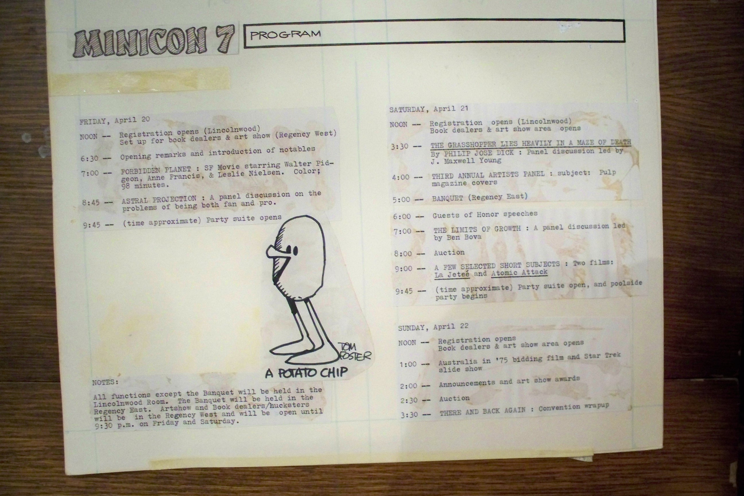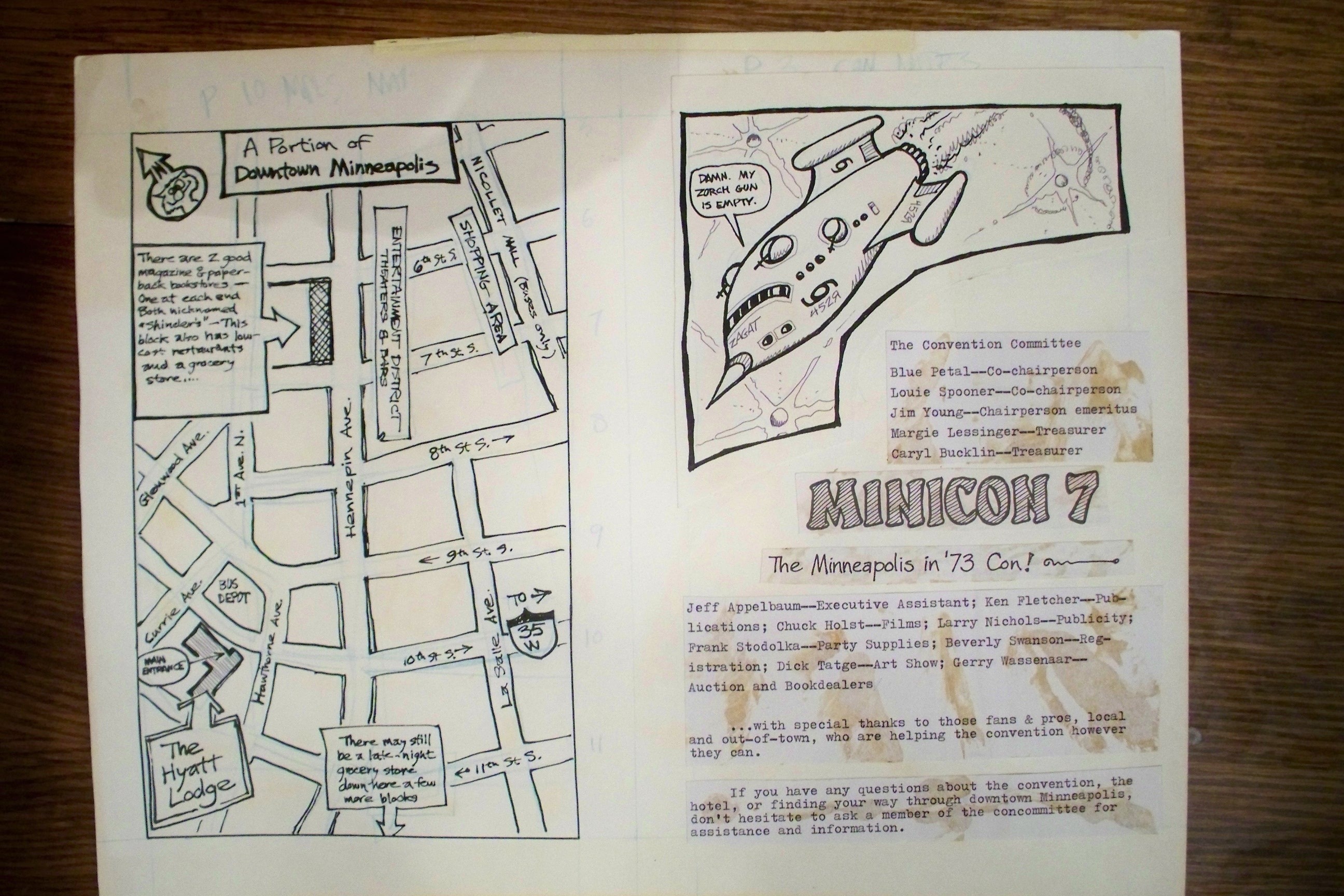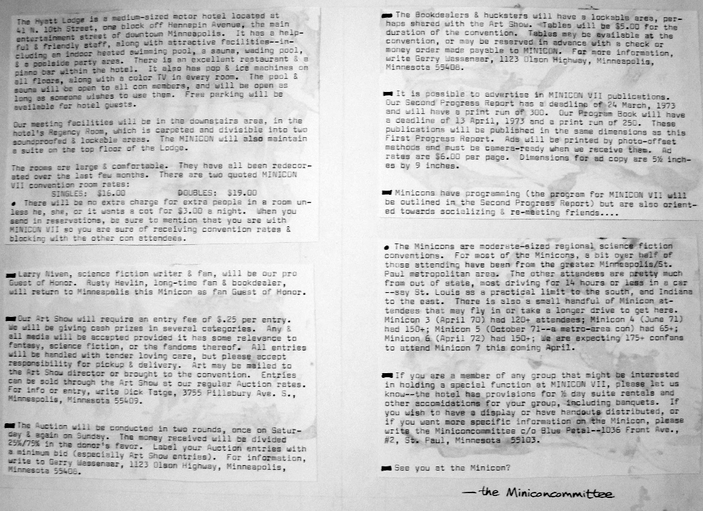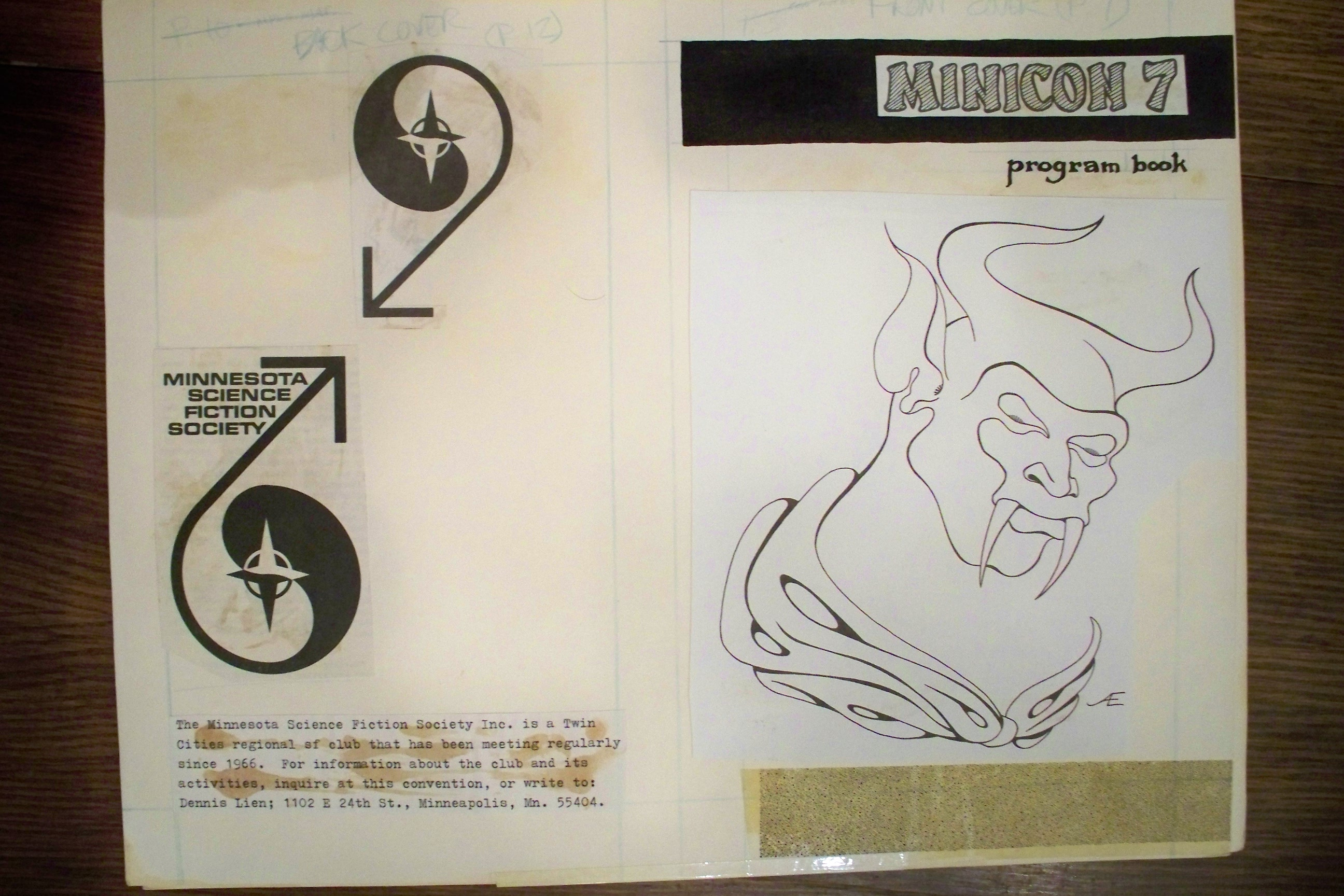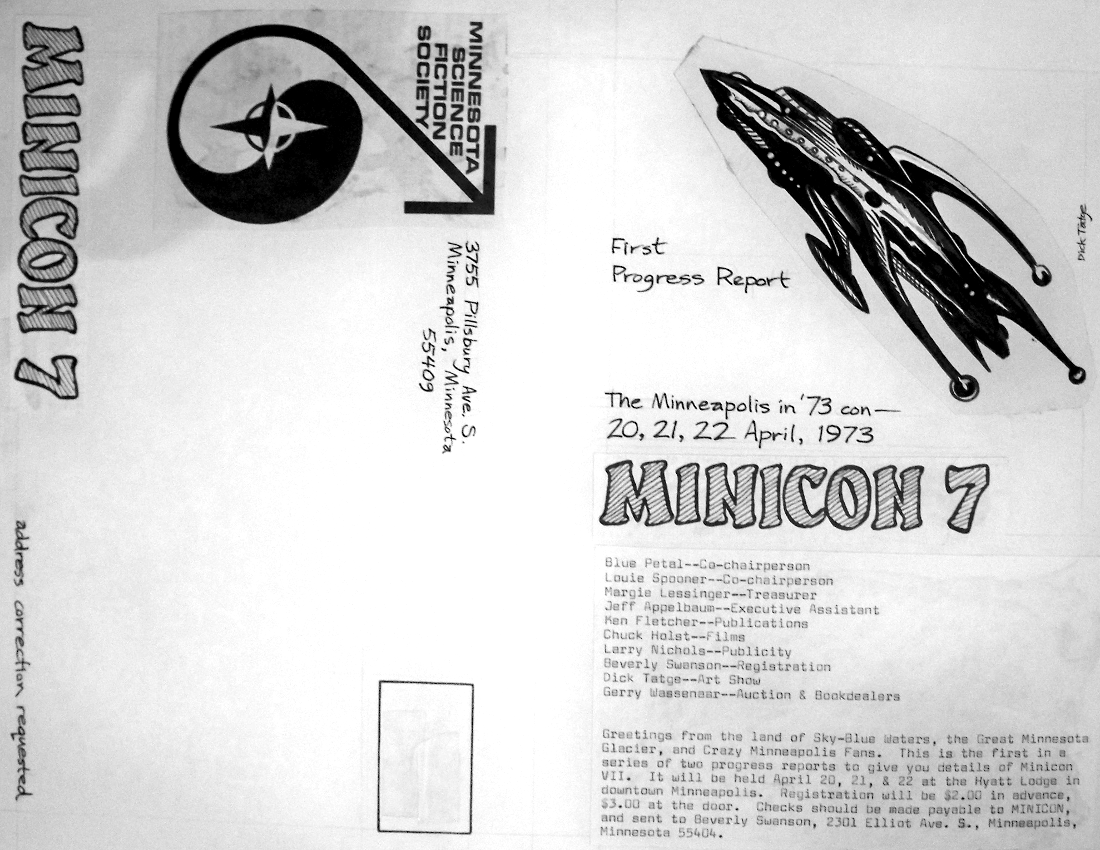 Long before we found an actual copy of the Minicon 7 program book, we found the original paste-up boards. They are missing only page 9, an advertisement. Here is a PDF of photographs of all the boards.