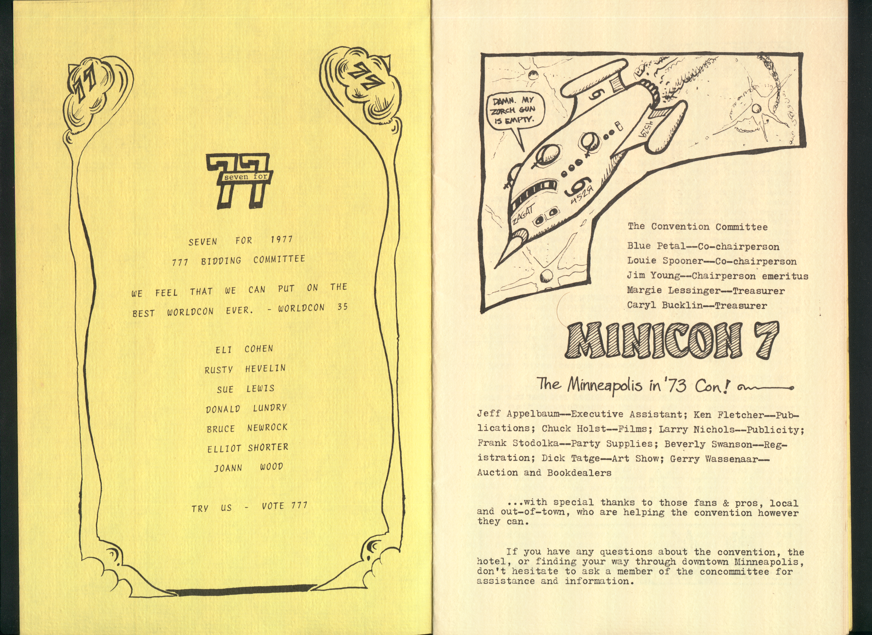 Jim Young--Chairperson emeritus Margie Lessinger--Treasurer Caryl Bucklin--Treasurer Jeff Appelbaum--Executive Assistant Ken Fletcher--Publications Chuck Holst--Films Larry Nichols--Publicity Frank Stodolka--Party Supplies Beverly Swanson--Registration Dick Tatge--Art Show Gerry Wassenaar--Auction and Bookdealers
