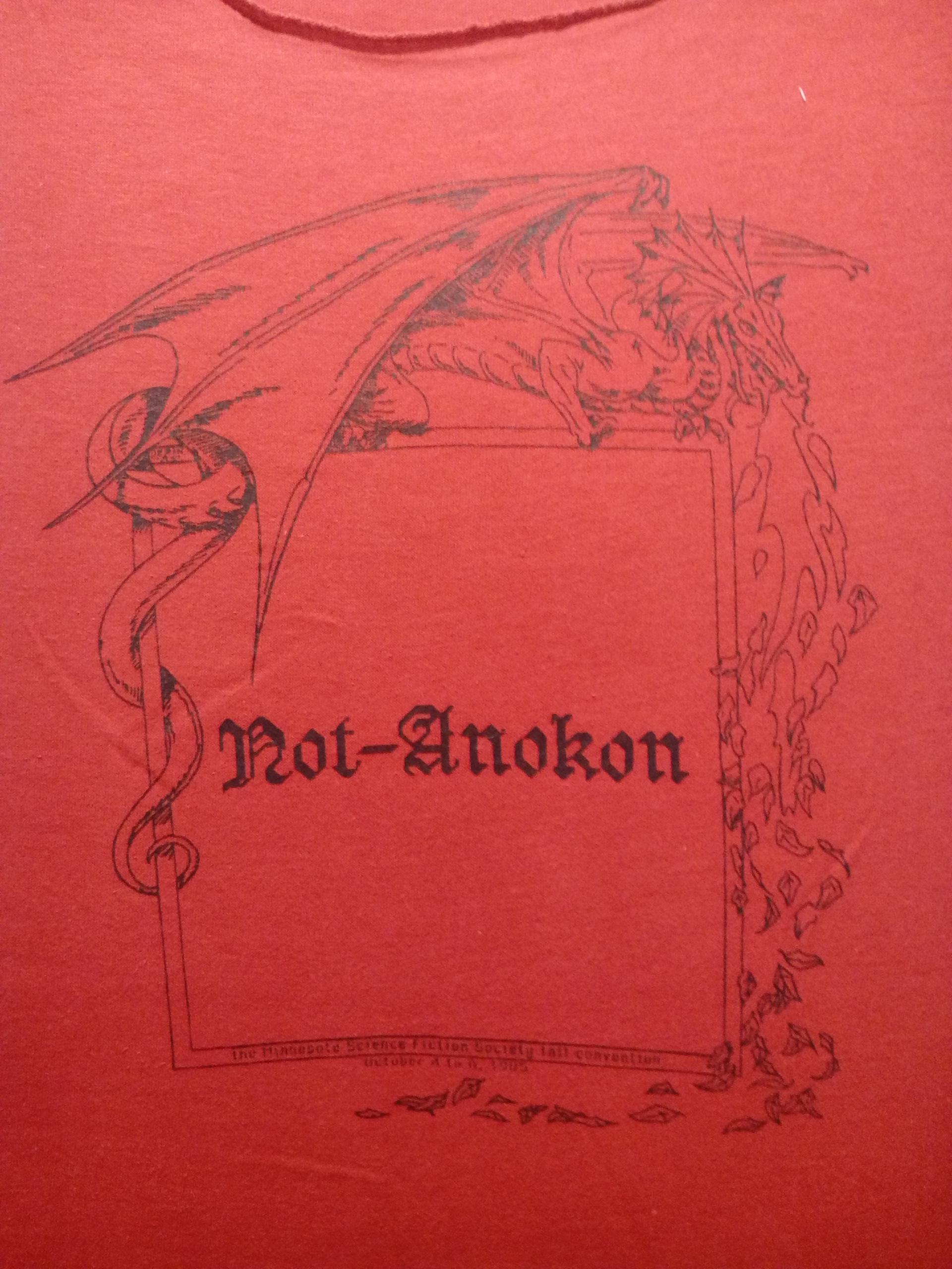 We originally listed the name of this con as it is now listed: "Not-Anokon '85", but we don't remember why. Then there was a lot of discussion about what the name really was. It is the third Minnstf convention called "Not-Anokon", and Beth F thought that maybe they called it "Not-Anokon 3", but also maybe not. David Dyer-Bennet attested that naming a con after the calendar year would have been "all wrong" for us during this period. The available primary sources were just the flyer and t-shirt, which both call it just "Not-Anokon". On this basis, I changed the listed name to just "Not-Anokon" (noting that it was the one in 1985).