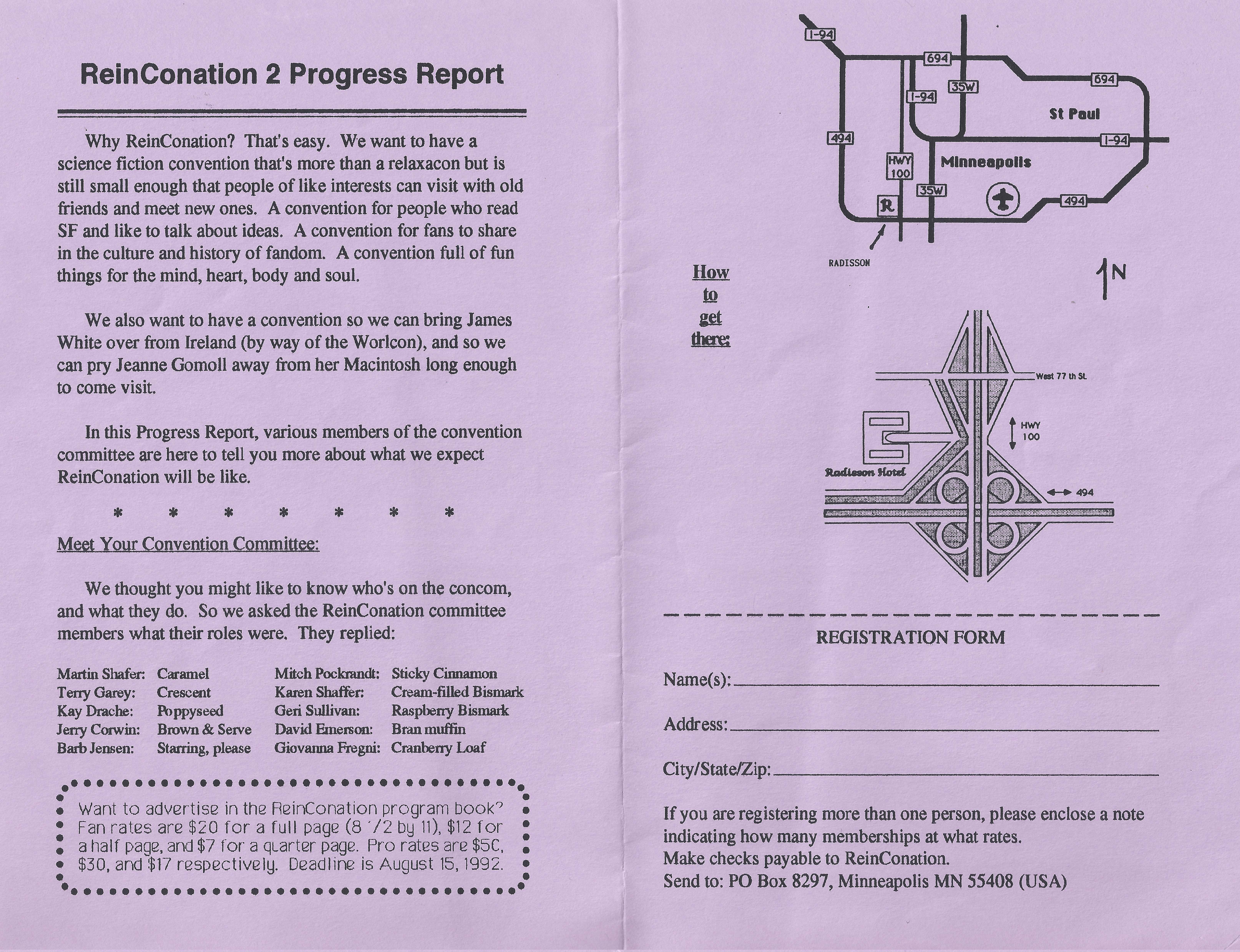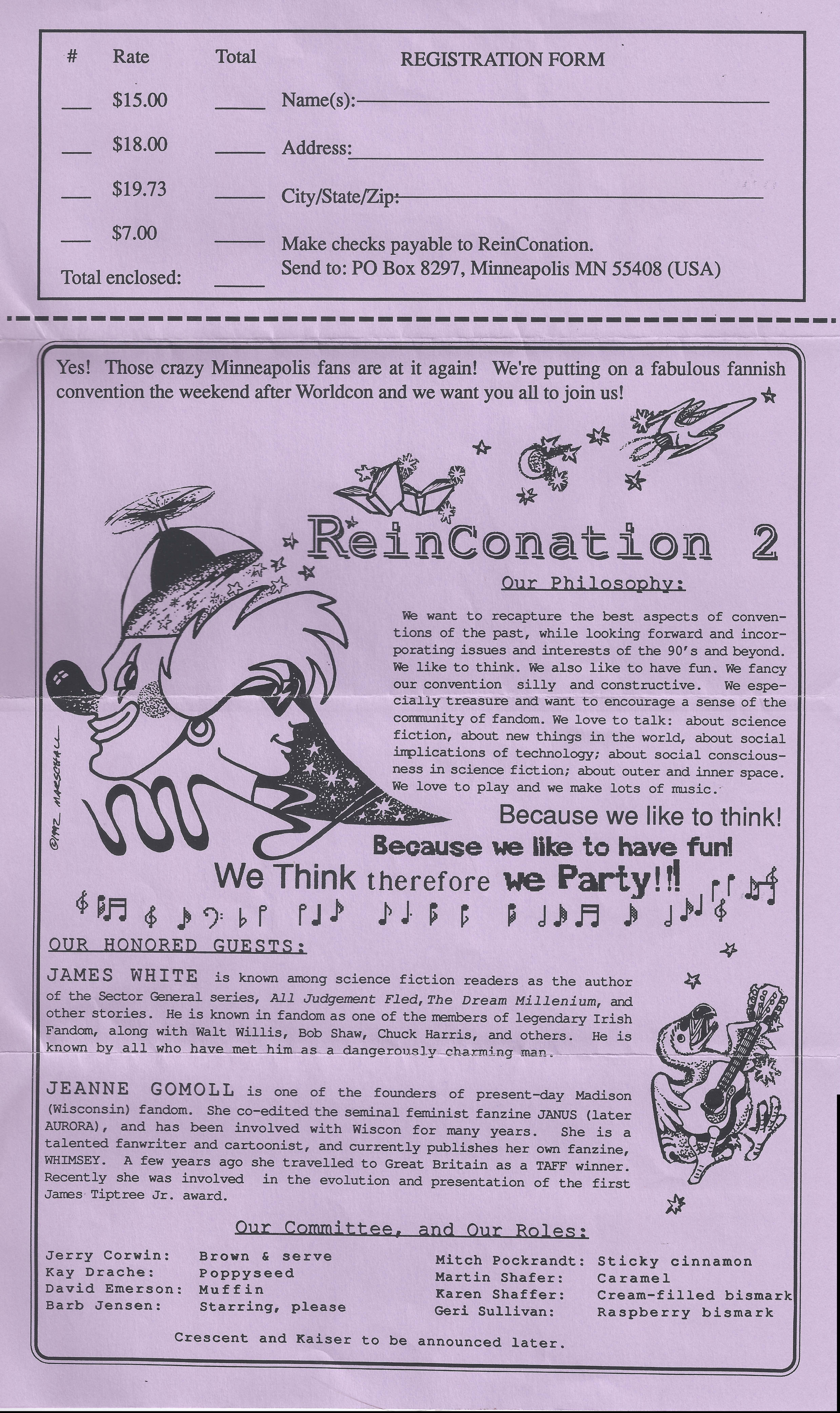 An ad for ReinCONation 2 appeared in the Minicon 27 program book, page 17.